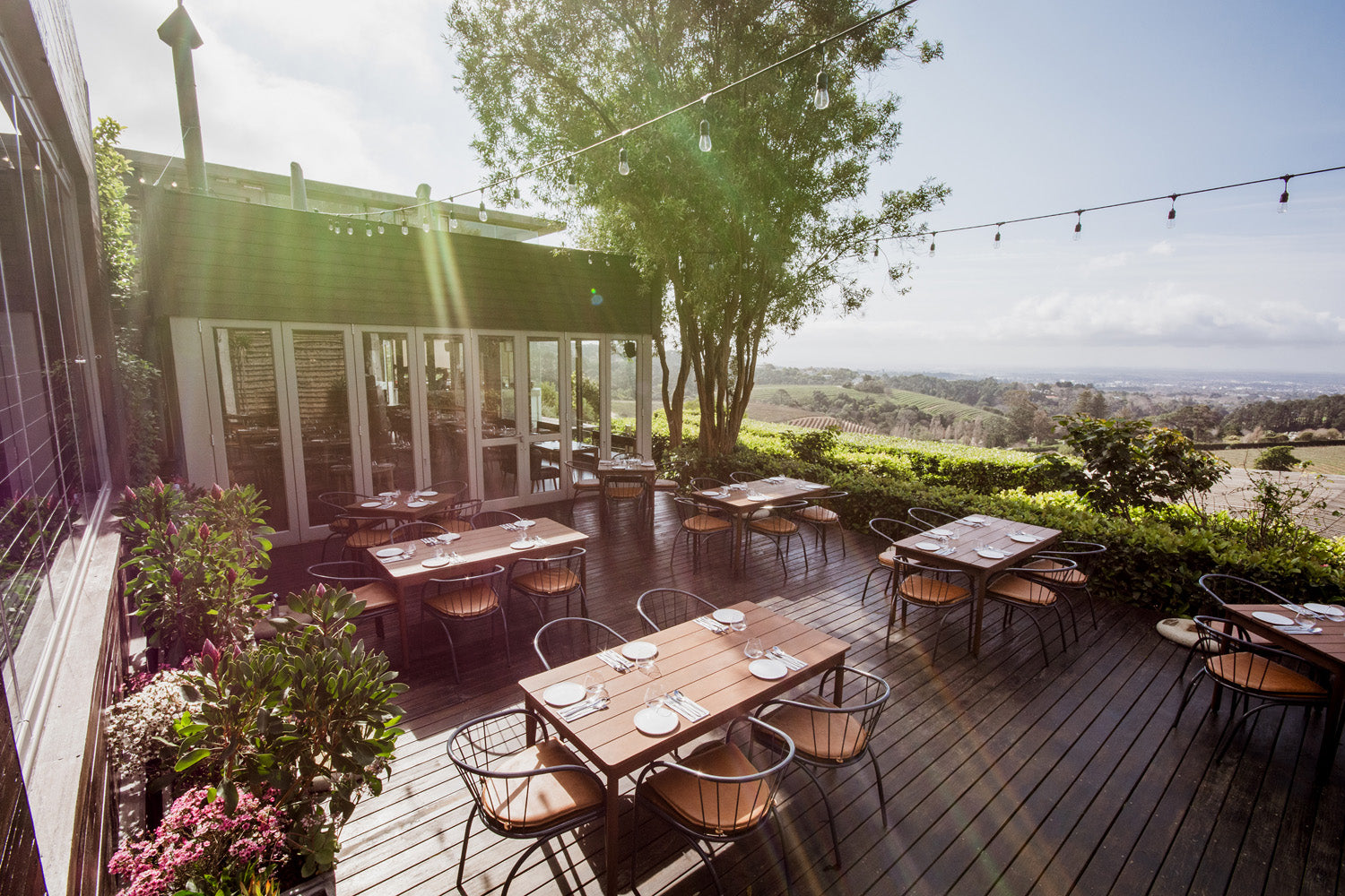 The top terrace boasts stunning views of the Beau Constantia's Vineyards and is furnished with custom-made Pedersen + Lennard outdoor Fluted Occasional Chairs.